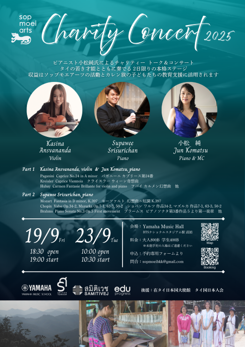 ※9/10までペアチケット(大人2名)1500バーツもお申込みいただけます。※未就学児のご入場はご遠慮いただいております。 【申込み】https://forms.gle/RNd7zLkVEjF6NBLJ9 【お問合せ】sopmoeibkk@gmail.com / 081-639-4869(磯村)