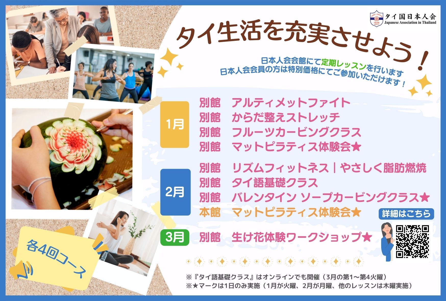 レッスン費(4回):会員 1,000B / 未入会の方 3,000B