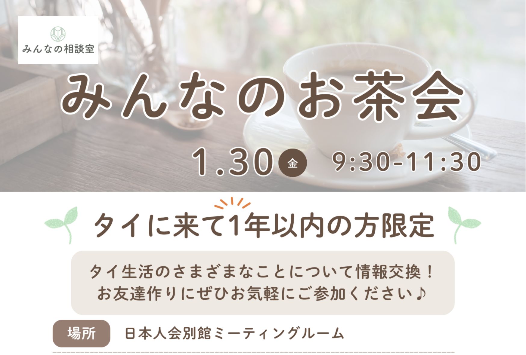 【みんなの相談室】1/30(金)『みんなのお茶会』来タイ1年以内の方限定お茶会