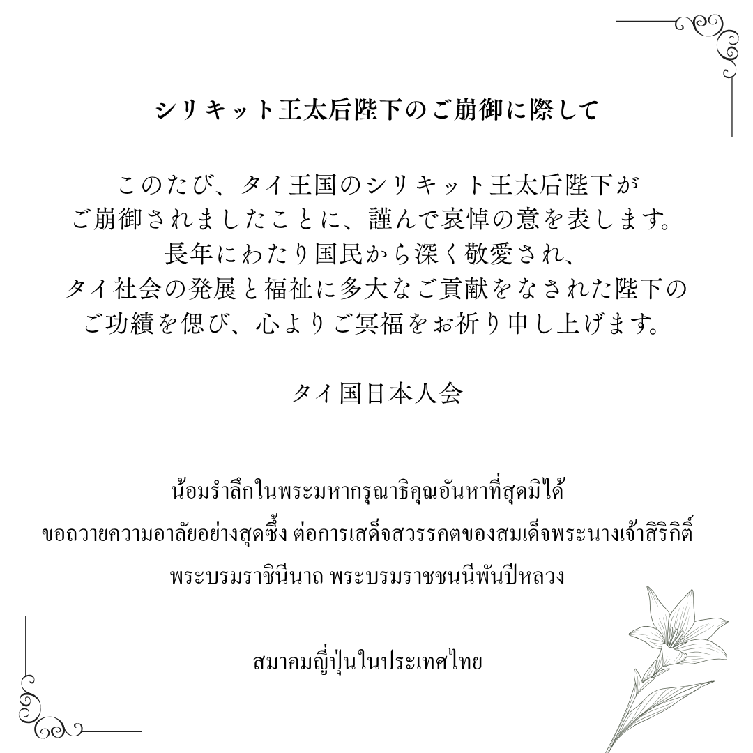長年にわたり国民から深く敬愛され、タイ社会の発展と福祉に多大なご貢献をなされた陛下のご功績を偲び、心よりご冥福をお祈り申し上げます。
