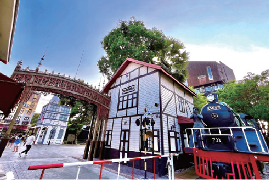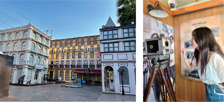 日本製の蒸気機関車が入口でお出迎え! 敷地内に足を踏み入れると、まるで映画のセットのようなヨーロッパ風のお洒落な建物が立ち並んでいます。建物ごとに異なる展示や体験が用意されており、タイに映画がどのようにして持ち込まれたのかを学べる展示や、エジソンが発明した映画の原型となる装置を実際に体験できる施設もあります。