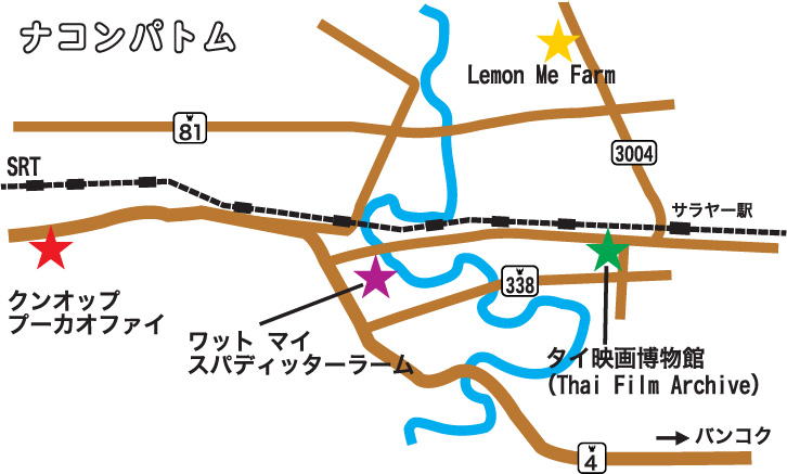 ②バスを利用の場合:戦勝記念塔駅から515/4-61のバスに乗車して約1時間半、Thai Film Archive駅で下車。