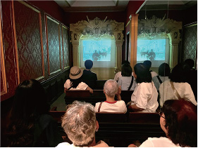 また、世界で初めて映画が上映されたといわれる『ホテル・スクリーブ・パリ』も忠実に再現。1階のカフェを抜け、地下へと続く階段を下りると、短編映画を鑑賞できるスペースが広がっています。スタッフが手動で映写機を回してくれる上映体験も!