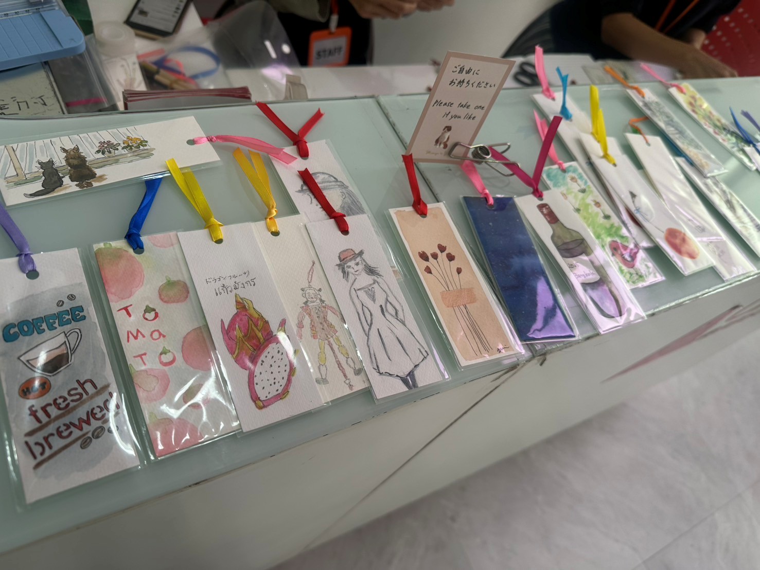栞作成のワークショップも行いました。子供たちに好評で、集中して何枚も書いている子もいました。