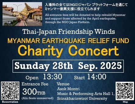 TJFWではタイ日メンバー出演者全員がボランティアで演奏し、ミャンマー被災地への復興のお手伝いが出来ないかとの思いで、本年9月28日(日)、ミャンマー地震チャリティーコンサートを開催する事にいたしました。
