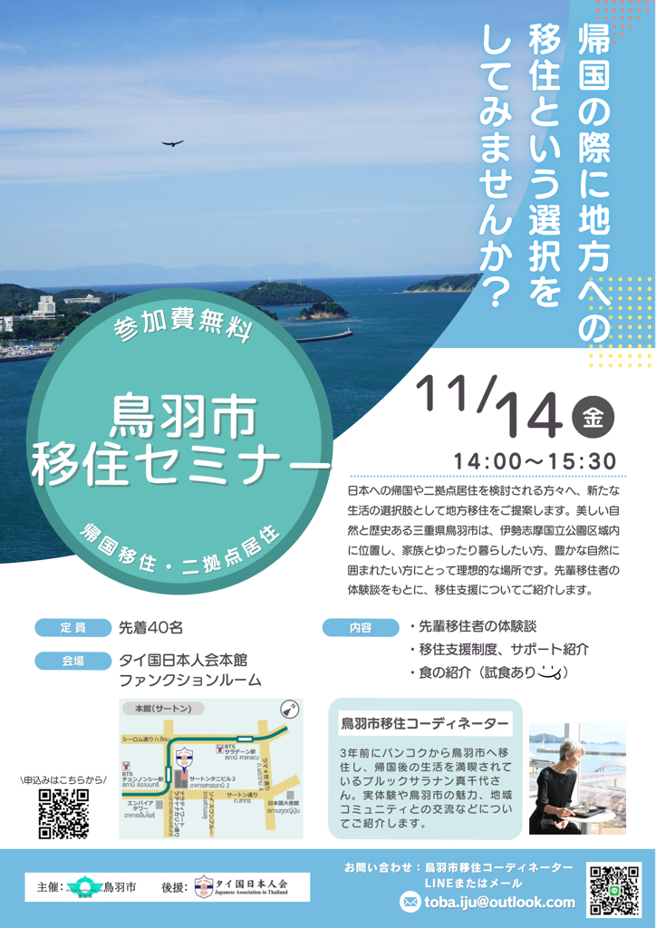 美しい自然と歴史のある三重県鳥羽市は、伊勢志摩国立公園区域内に位置し、家族とゆったり暮らしたい方、豊かな自然に囲まれたい方にとって理想的な場所です。他の伊勢志摩地域にも簡単にアクセスでき、旅するように暮らせるまちです。本セミナーでは、実際にバンコクから鳥羽市へ移住された先輩移住者の体験談を基に、鳥羽市の魅力や移住に関する支援制度、住居の情報、地域コミュニティとの交流方法などについて詳しくご紹介します。