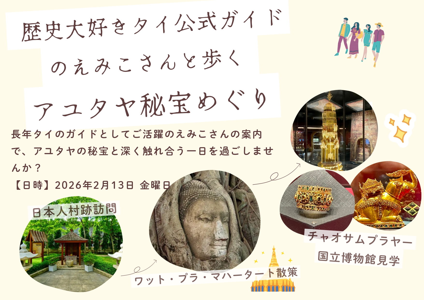 長年タイのガイドとしてご活躍のえみこさんの案内で、アユタヤの秘宝と深く触れ合う一日を過ごしませんか?