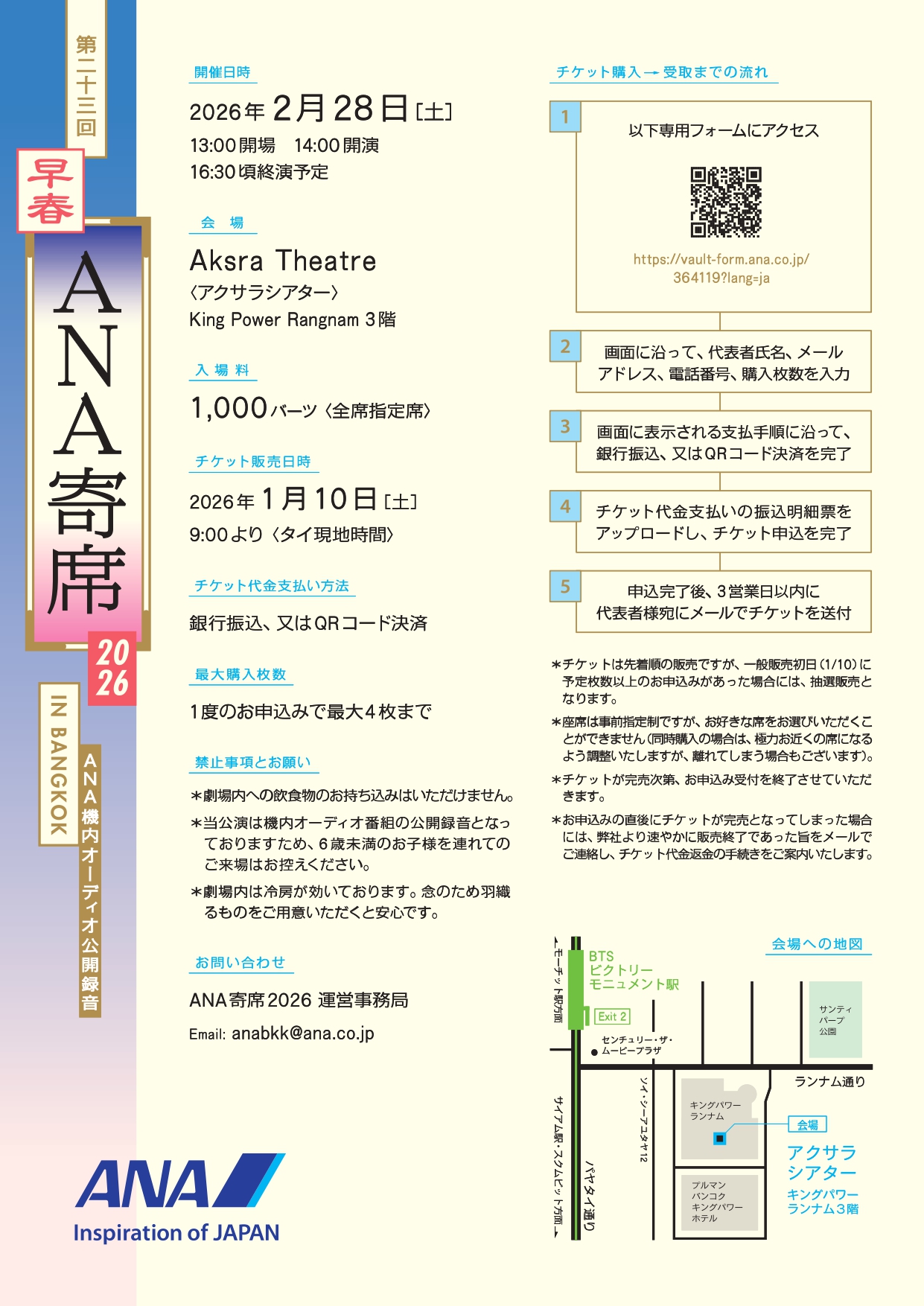 毎年ご好評をいただいている「ANA寄席」が、2026年早春、バンコクにて開催されます。