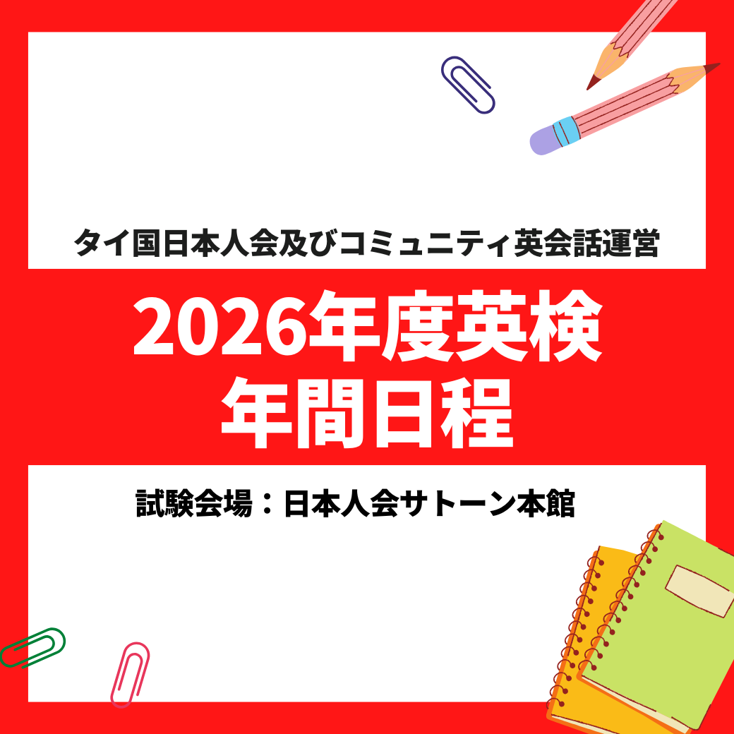 タイ国日本人会及びコミュニティ英会話にて運営するバンコク準会場の2026年度実施の実用英語技能検定(英検)の日程をご案内いたします。
