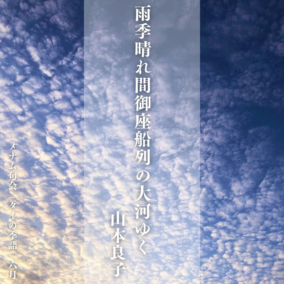 今年は5月20日に雨季入りとなりました。マンゴスチンやドリアンなど雨季の果物も出始めましたね。さて、この俳句の「御座船」は2006年のラーマ九世王御在位60周年の時でしょうか。実は今年も、ラーマ十世王の72歳(干支で6回り)の祝賀御座船パレードが10月27日に予定されています。絢爛豪華な船がチャオプラヤー川をゆったりとゆく光景、古式ゆかしい衣装に身を包んだ隊員たちの息の合った漕ぎぶりも見ものです。どうぞお見逃しなく!(イーブン美奈子)
