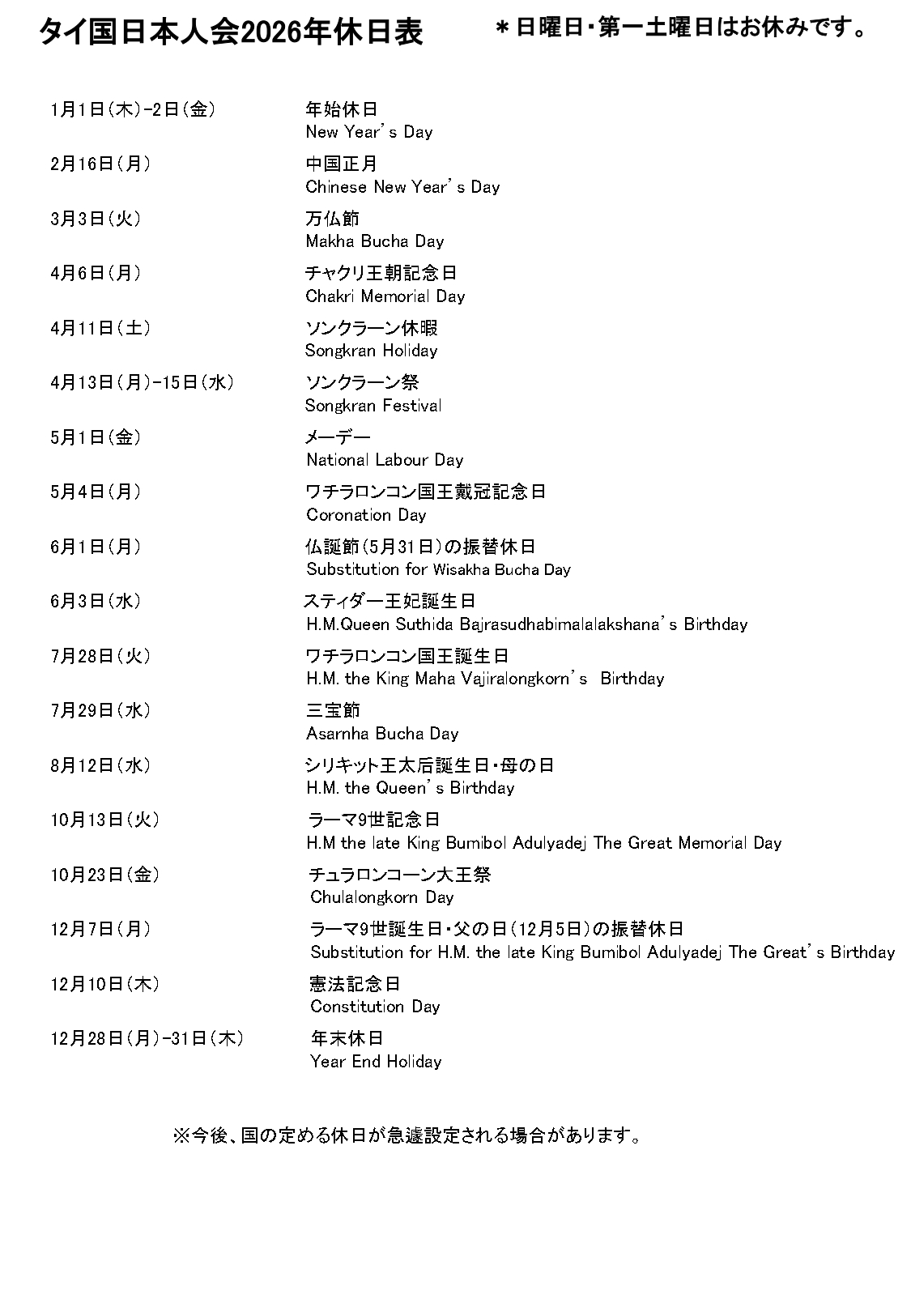 日本人会では、年末年始休業の期間を以下の通りとさせていただきます。