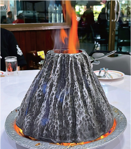 まるで火山が噴火したような演出でエビに香ばしい焼き色をつけます。無料でエビの殻をむいてくれるサービスもありがたいですね。