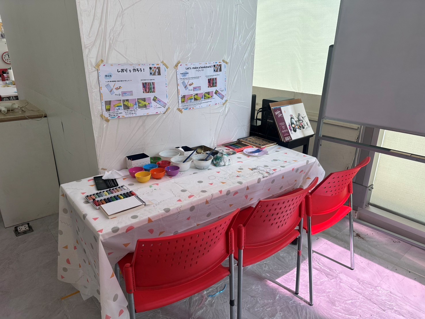 栞作成のワークショップも行いました。子供たちに好評で、集中して何枚も書いている子もいました。