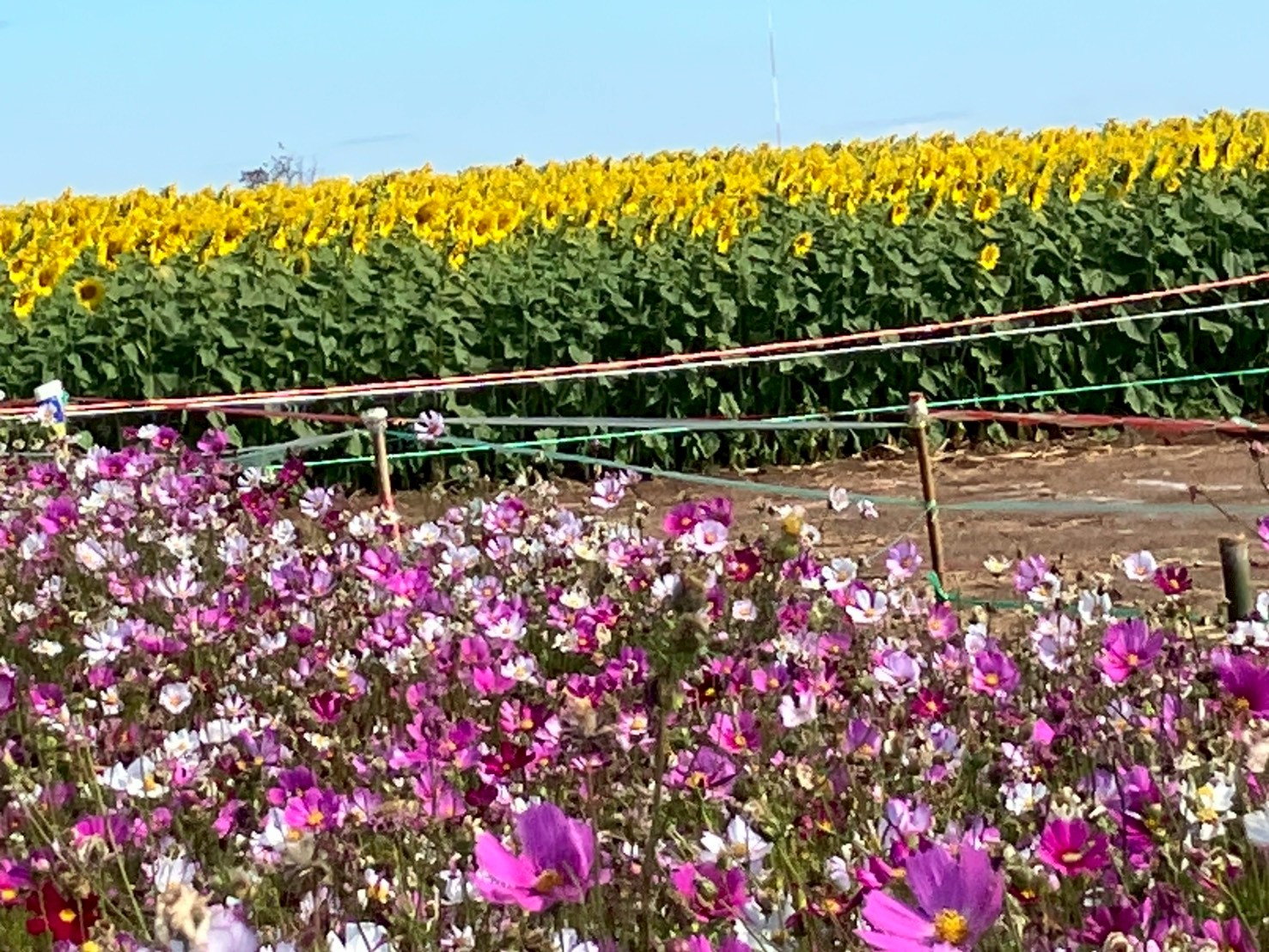 ひまわりとコスモスが同時に咲いている広大な農園で、伸び伸び